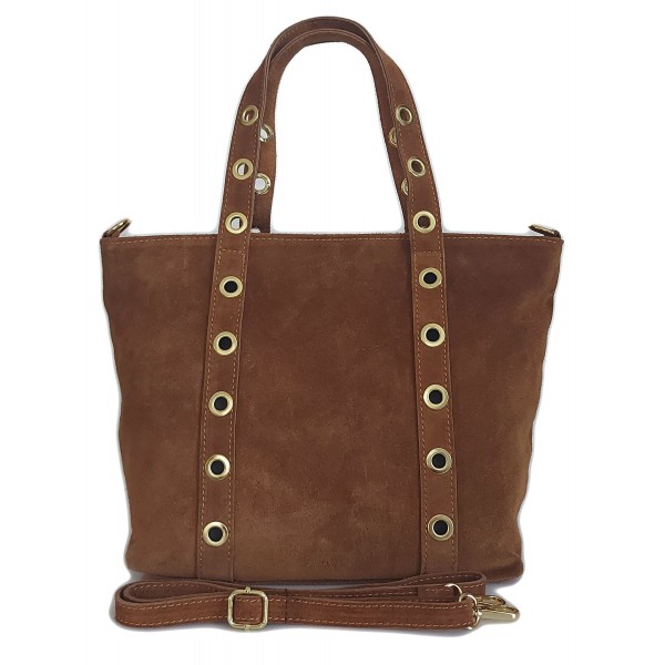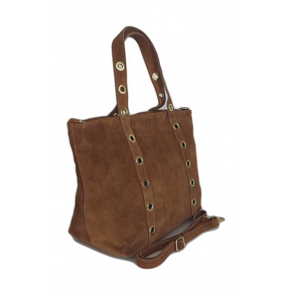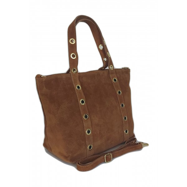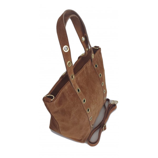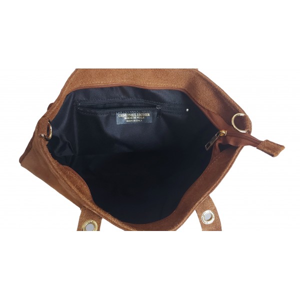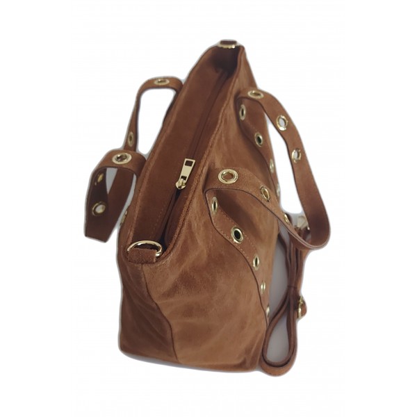 Skórzany Włoski worek ,torba na ramię Vera Pelle miękki zamsz złote dżety-kółka, pojemna A4 Camel WZK25C