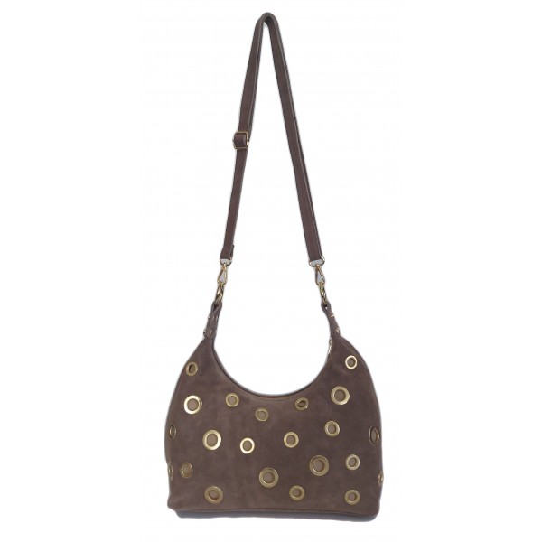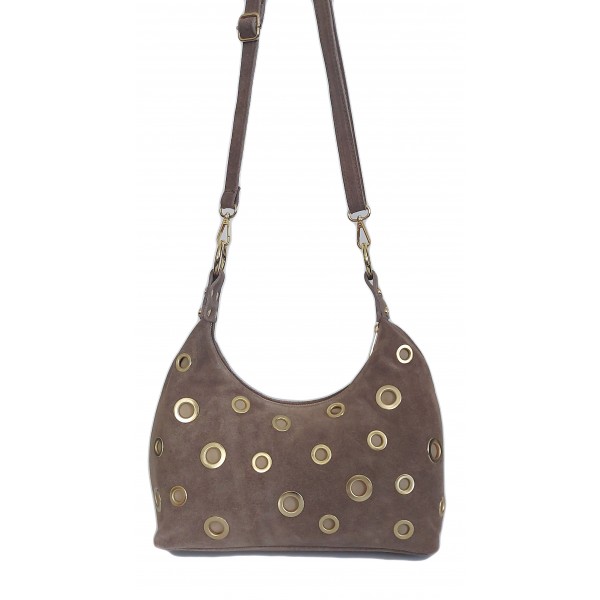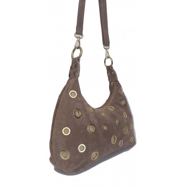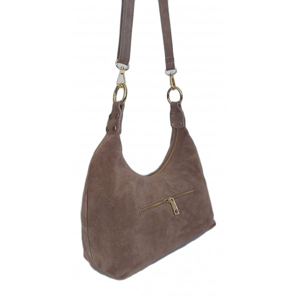 Włoska duża zamszowa listonoszka, nerka Vera Pelle złote okucia kółka Beżowa LZK25T