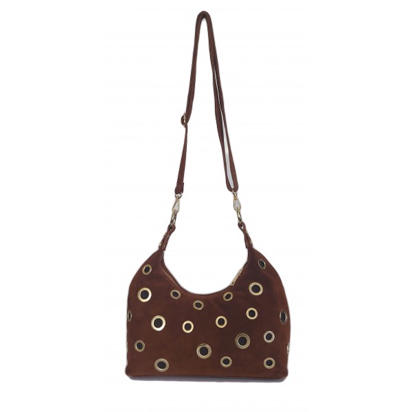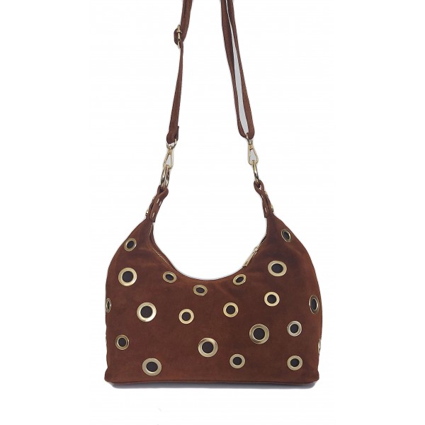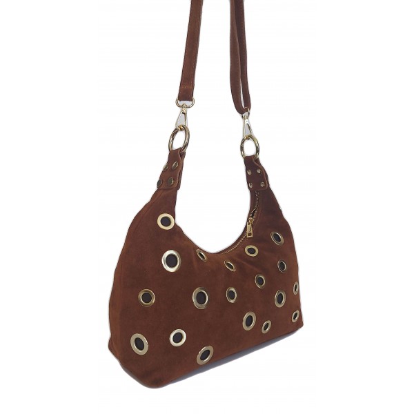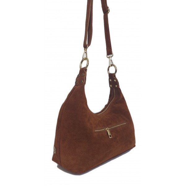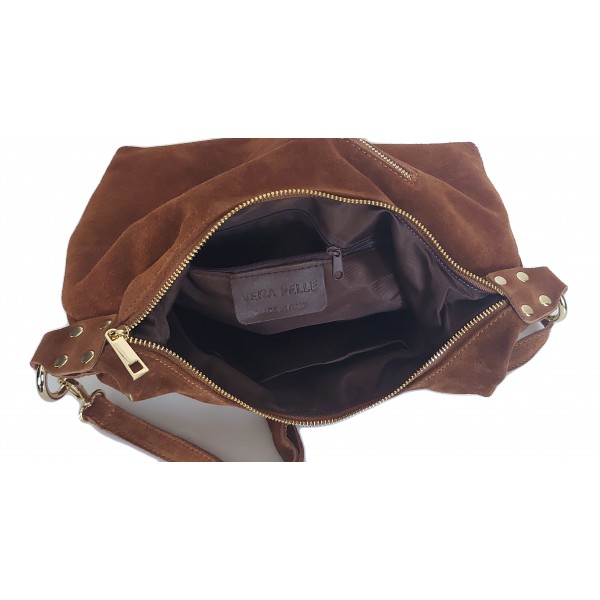 Włoska duża zamszowa listonoszka, nerka Vera Pelle złote okucia kółka Camel LZK25C