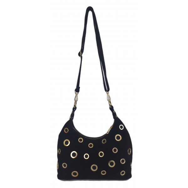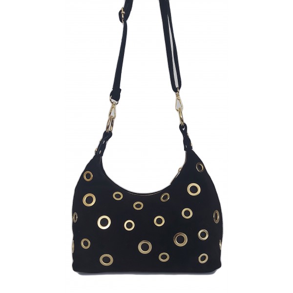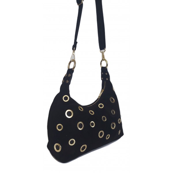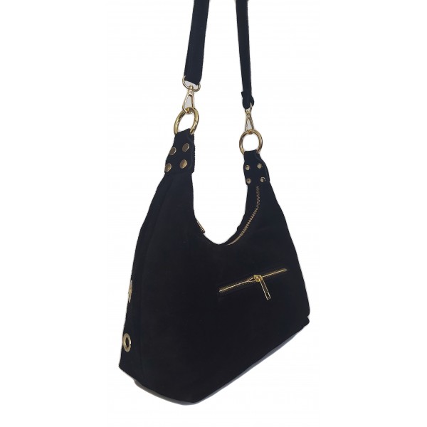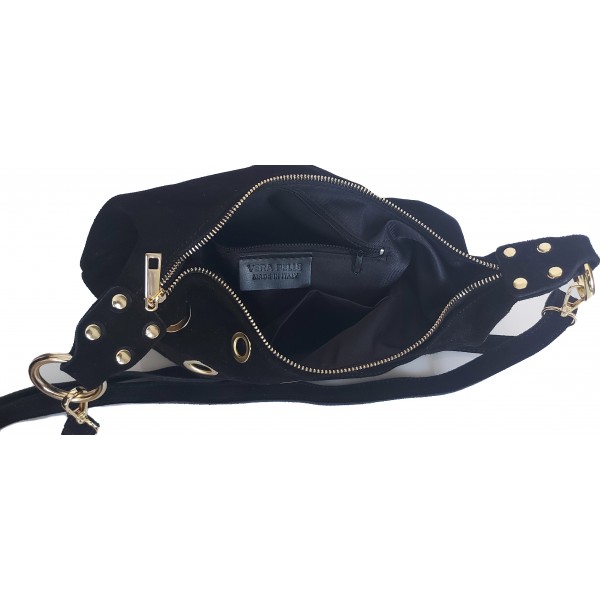 Włoska duża zamszowa listonoszka, nerka Vera Pelle złote okucia kółka Czarna LZK25N