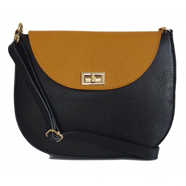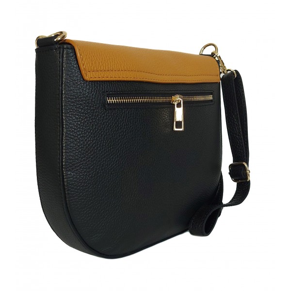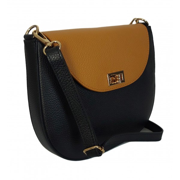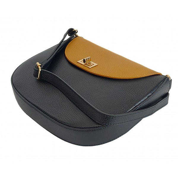 Włoska skórzana listonoszka podkówka Vera Pelle , pojemna złote okucia Czarna z Camelem VPP38NC