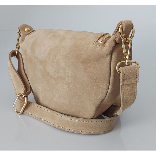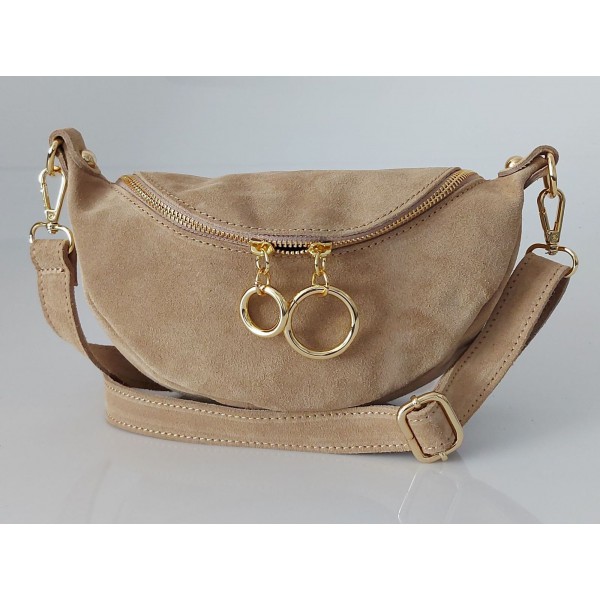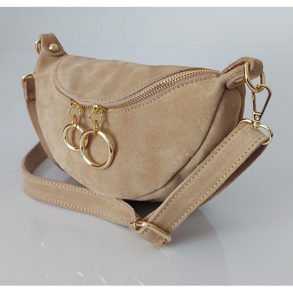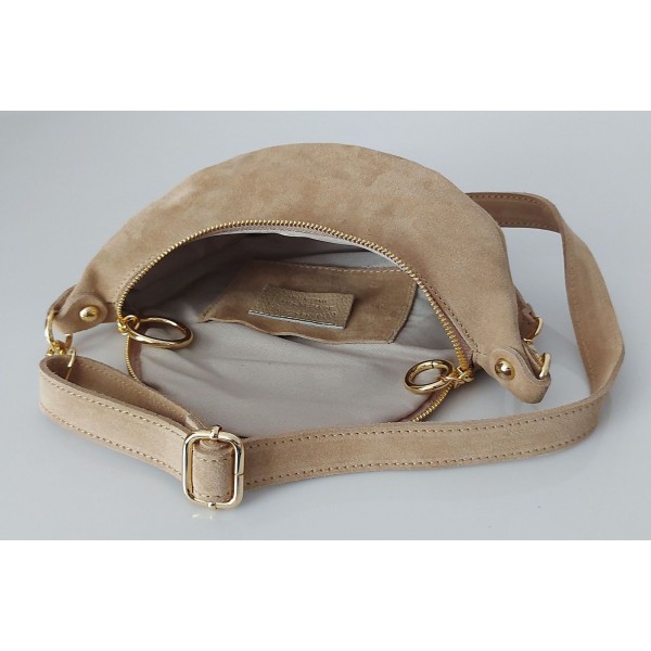 Włoska zamszowa listonoszka, nerka Vera Pelle złote okucia kółka Beżowa LN633T