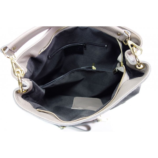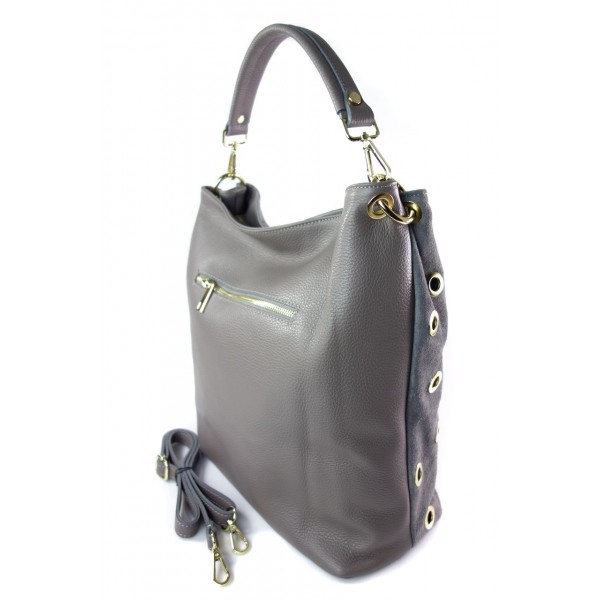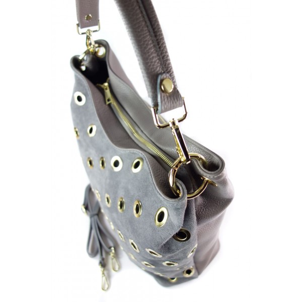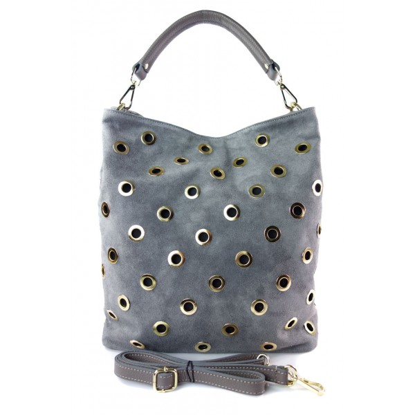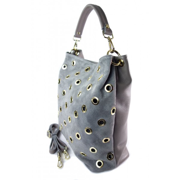 Zamszowy worek, złote okucia,dżety, kółka, Vera Pelle pojemny Szary WK579GZ